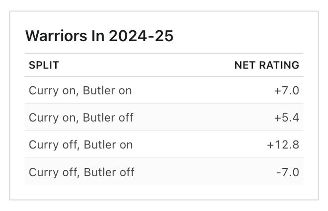根據(jù)ESPN給出的數(shù)據(jù),在上賽季的后半個賽季,當(dāng)巴特勒來到灣區(qū),勇士已經(jīng)成了聯(lián)盟最好的球隊之一。在得到巴特勒之前,勇士的戰(zhàn)績?yōu)?5勝26負(fù),凈勝分為-0.4;但從巴特勒首次亮相到常規(guī)賽結(jié)束,球隊的防守效率排名第一,凈勝分排名第三,每100回合能夠凈勝對手9.2分,球隊在這段時間里打出23勝8負(fù)的戰(zhàn)績。根據(jù)ESPN的模型推算,如果換算到整個賽季,這支勇士有可能得到61勝。彼時,進入季后賽的勇士在首輪爆冷擊敗了西部二號種子火箭,并在與森林狼隊的比賽中贏得第一場,如果不是因為庫里腿筋拉傷,勇士甚至有可能走得更遠(yuǎn)。